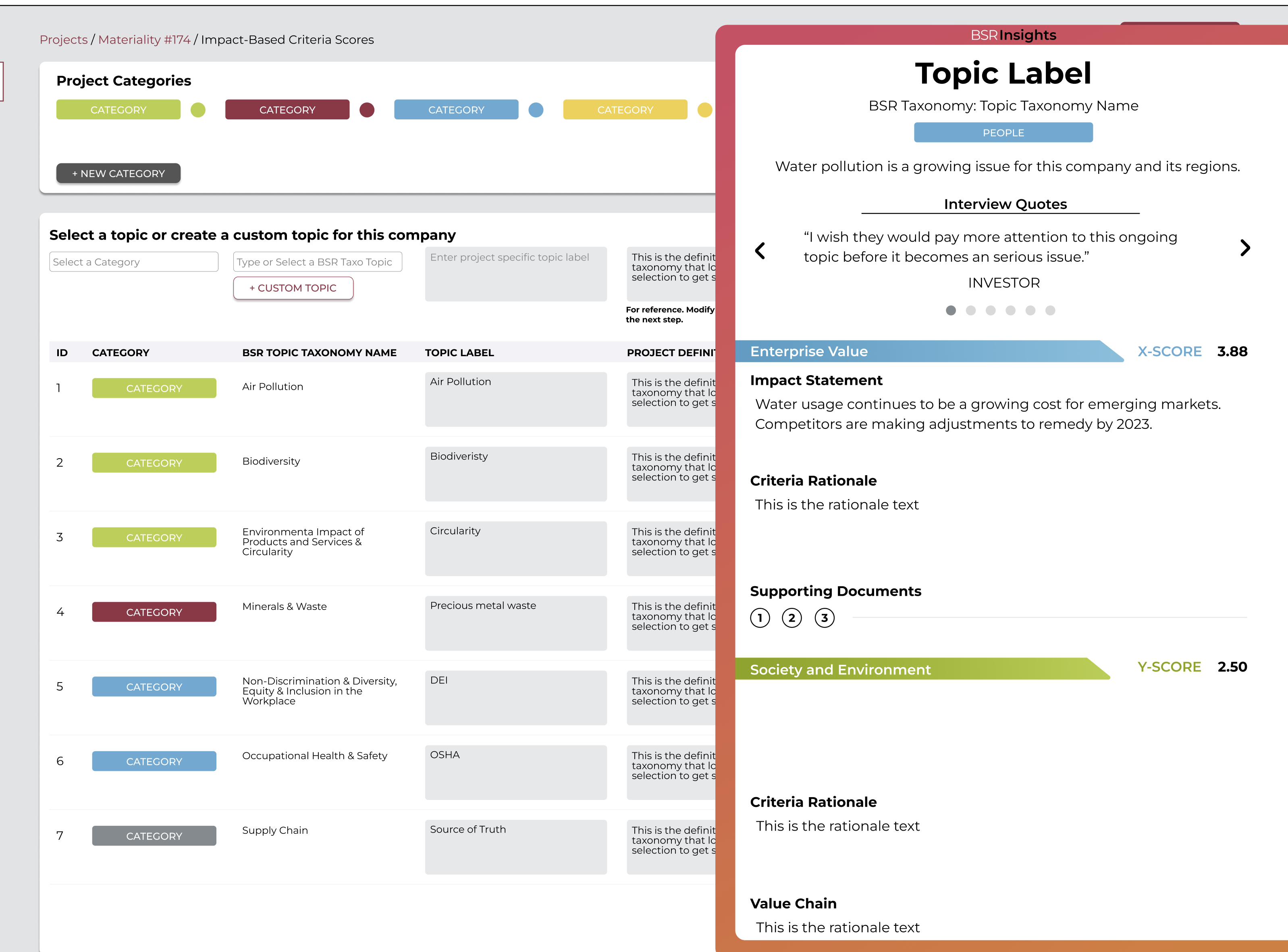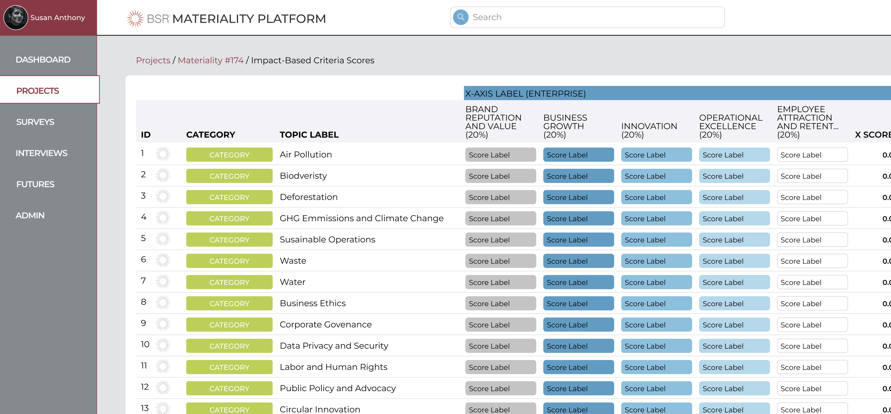 A business intelligence web app to capture, prioritize, and aggregate ESG topics for global organizations, modeling impact trajectories over the next decade.